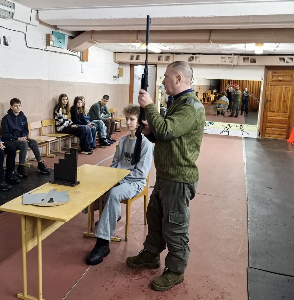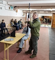 После завершении экскурсии ребятам было предложено посетить учебно-тренировочное занятие по стрельбе, которое провёл в стрелковом тире нашей школы руководитель по военно-патриотическому воспитанию нашей школы Дмитрий Олегович Давыдов. Учащиеся учились стрелять из лазерного оружия с дистанции 10 метров на интерактивном тренажере.