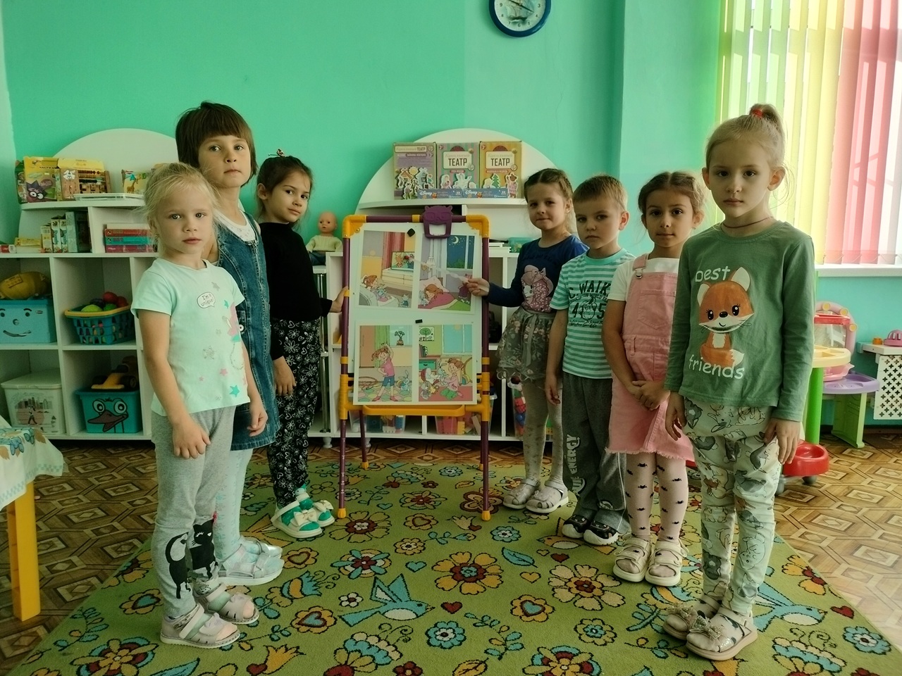З мэтай развiцця ўмення ствараць связныя выказваннi па карцiнках, 16 кастрычнiка 2025 года ў старэйшай группе «Б» быў праведзены занятак на тэму «Наш дзень».